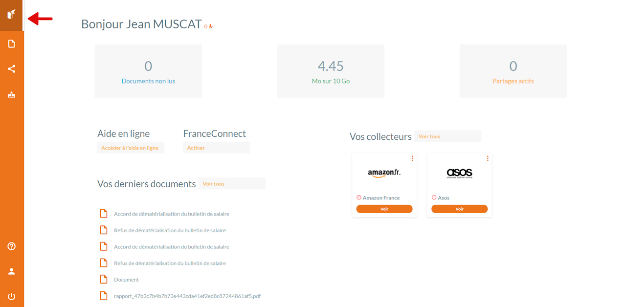 L'onglet "Accueil" vous permet de visualiser différentes informations telles que vos derniers documents reçus et documents non lus, l'espace de stockage restant dans votre coffre ou le nombre de partages en cours.
